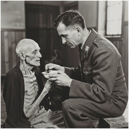 In this moment of profound darkness, an American soldier approached the man, kneeling beside him with the gentleness of a caregiver. He offered spoonfuls of broth to the man’s parched lips, whispering softly, “Don’t give up. I’ll help you eat.”