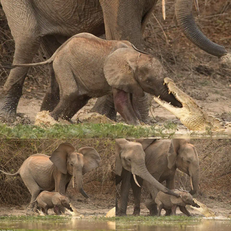 The herd, sensing the danger, erupted in chaos. Elephants trumpeted loudly, their massive bodies charging in every direction, trying to intervene. Dust and water filled the air as panic spread like wildfire. The other elephants attempted to reach the calf, but the crocodile’s grip was unrelenting, its hold too strong for any of them to break. For a moment, it seemed as if all hope was lost, the calf’s struggles growing weaker against the predator’s strength.